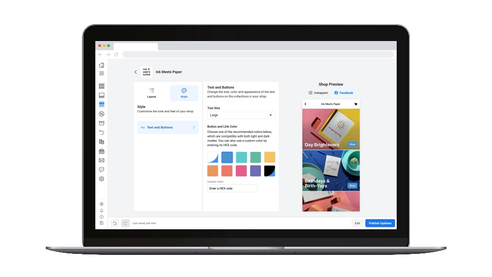 A Facebook Shops nagy előnye, hogy olyan megjelenést és érzetet enged kialakítani, amely összhangban van a márkáddal