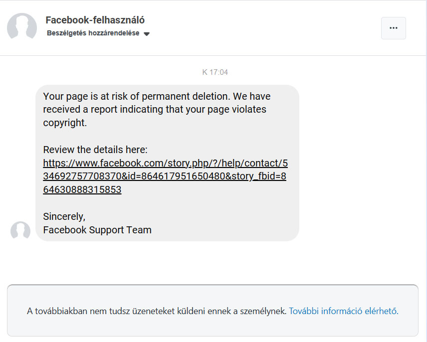 Az utóbbi pár hétben megszaporodott az adathalászok által küldött üzenetek száma, amelyben hamis állításokról írnak és az oldal törlésével is fenyegetőznek, bár már számtalan variációban próbálkoznak, ezek a leggyakoribbak. Azonban van néhány trükk, hogy felismerd a hamis fenyegetések jellegzetességeit. Többek között szinte sosem magyar neveket használnak, illetve a legtöbbször profilkép nélküli fiókokból írnak. Egyes esetekben már profilképet is töltenek fel, hogy még inkább igazinak tűnjön az átverés. A következő intő jel, hogy már a megszólítás is irreleváns. Senkit nem szólítunk meg úgy, hogy hello bolt, nem igaz? Azonban ha ez még nem lenne elég, a magyar nyelv már feladja a leckét a hackerek számára. A szavak külön-külön értelmesek, de együtt már nem igazán alkotnak szép kerek mondatokat, mondhatni erősen törik a nyelvet. Mivel nem beszélik jól a mi nyelvünket, elő szokott fordulni, hogy spanyolul, olaszul vagy japánul is küldenek üzenetet, abban reménykedve, hogy rákattint valaki a linkre.